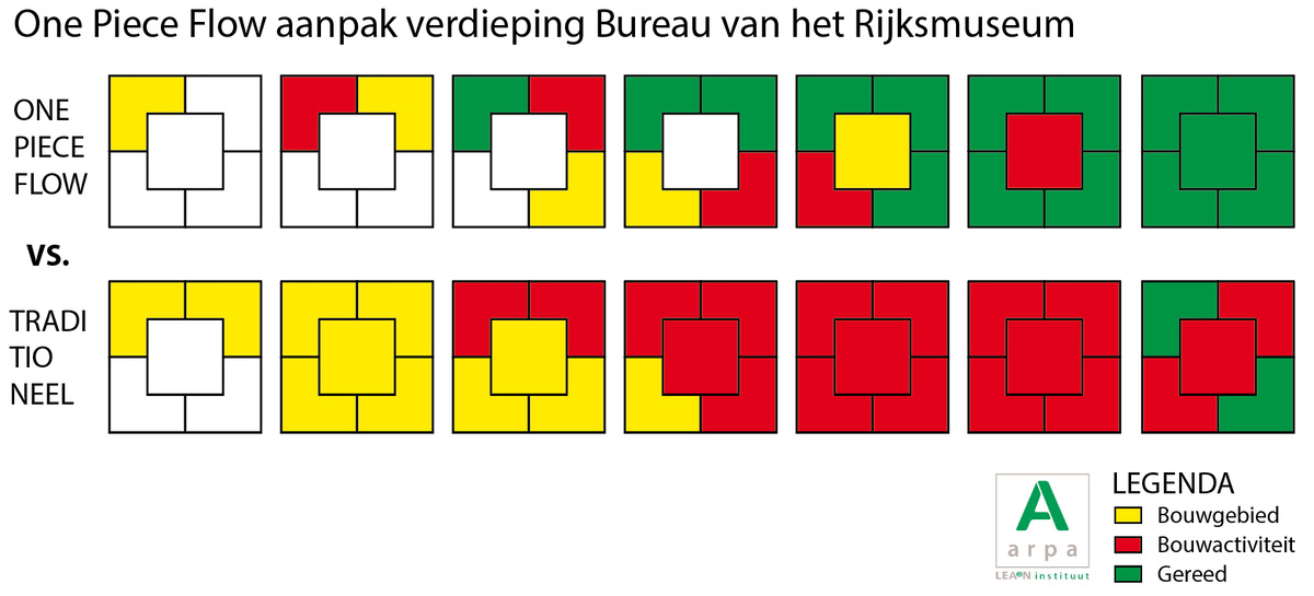 Karel Kalis: “Een project als dit vereist een uitgekiende logistiek. Het ontbreken van ruimte voor een bouwplaats hebben we ondervangen door Just In Time delivery. Steeds werd daarbij een dagvoorraad materiaal gebracht en de aanvoerende transporteur nam meteen het vrijkomende materiaal mee terug. Zo hadden we meteen een minimale impact op het drukke stadsverkeer. Maar er was meer nodig. Bij Arpa Learn Instituut leerde ik het fenomeen one-piece-flow kennen. We besloten met het integrale team de principes van deze methodiek naar dit renovatieproject te vertalen. Daarbij hebben we de villa verdeeld in een aanpak per verdieping en op iedere verdieping per kamer. We hebben hierbij consequent een kamer/verdieping afgewerkt en opgeleverd, dus de verdieping leeghalen, vloeren, stucwerk, verlichting, schilderen, voorbereiden nieuwe installatie; alle activiteiten na elkaar. Dit levert een aantal voordelen op: het bouwgebied is klein, er is continue productiviteit dus het gaat snel en stabiel én je bent heel flexibel. De ervaring en het resultaat van kamer 1 is snel zichtbaar. Daar kun je bij kamer 2 dus al op sturen. Andere kleur? Ander armatuur? Matte in plaats van glanslak: geen probleem. In tegenstelling tot traditioneel bouwen blijft bij de one-piece-flow de invloed die de opdrachtgever op het proces kan uitoefenen heel hoog. Dat is echte klantwaarde!”