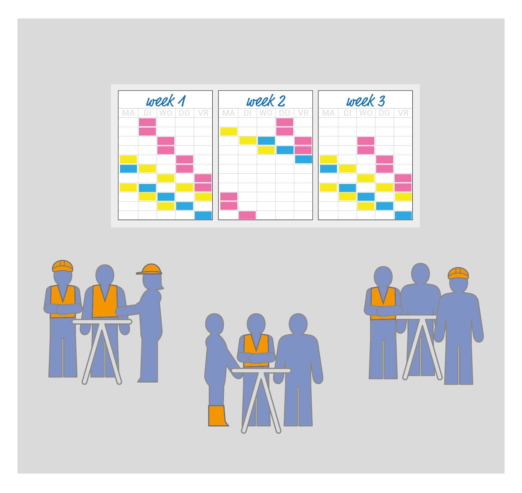 In de Kortetermijnplanning wordt de projectplanning vertaald naar concrete acties op dagniveau voor de komende drie tot acht weken. Hier wordt vastgelegd welk werk de betrokken teams, zoals engineers en productiemedewerkers, moeten uitvoeren. Productieleiders, teamleiders, uitvoerders of afdelingshoofden zijn op dit niveau verantwoordelijk voor het inzetten van de resources en het bewaken van de voortgang. Bij eventuele verstoringen, moeten zij bijsturen of escaleren.