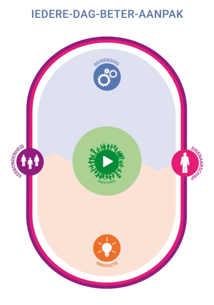 Onze unieke en bewezen Iedere-Dag-Beter-aanpak combineert procesoptimalisatie en innovatie met team- en persoonlijke ontwikkeling. Vanuit 5 focusgebieden zorgt deze aanpak dat teams optimaal presteren door het creëren van basisstabiliteit in het dagelijkse werk en het realiseren van continue innovatie: